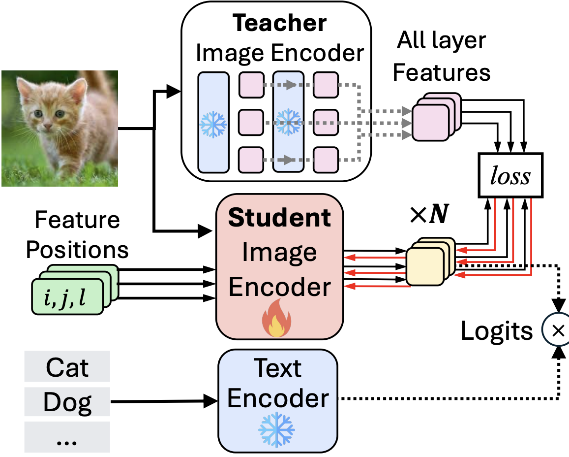 Layer Query Network (LQN), a lightweight five-layer MLP that adapts a frozen VLM in one forward pass. LQN distills intermediate-layer tokens from VLM and self-supervise achieving faster convergence and strong dense-prediction performance, outperforming the teacher VLM.